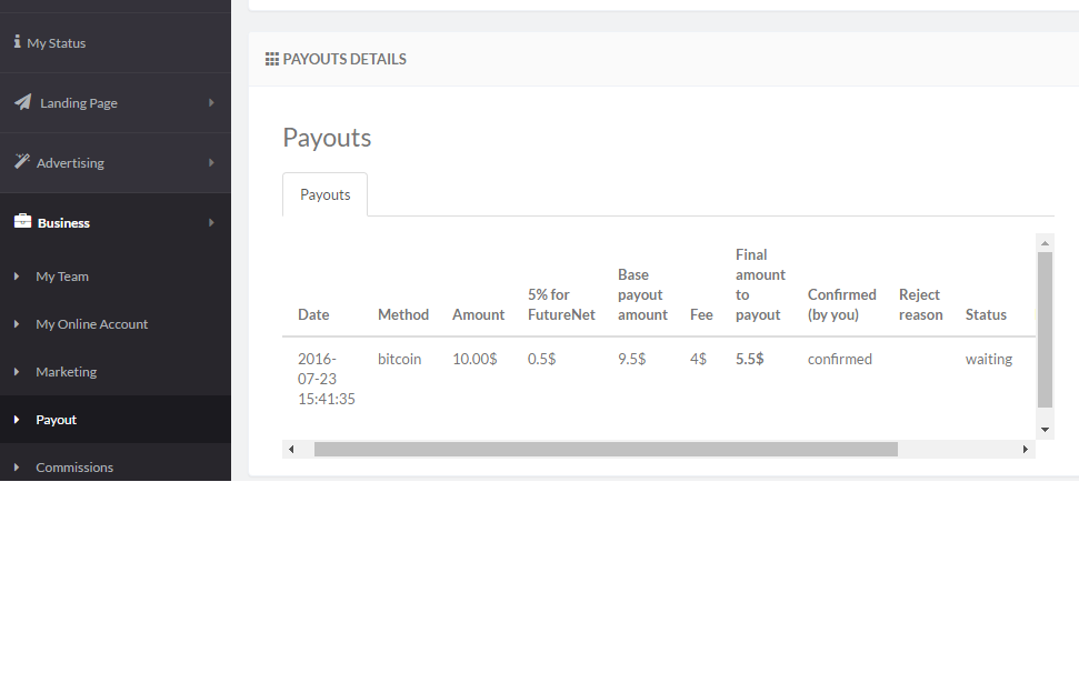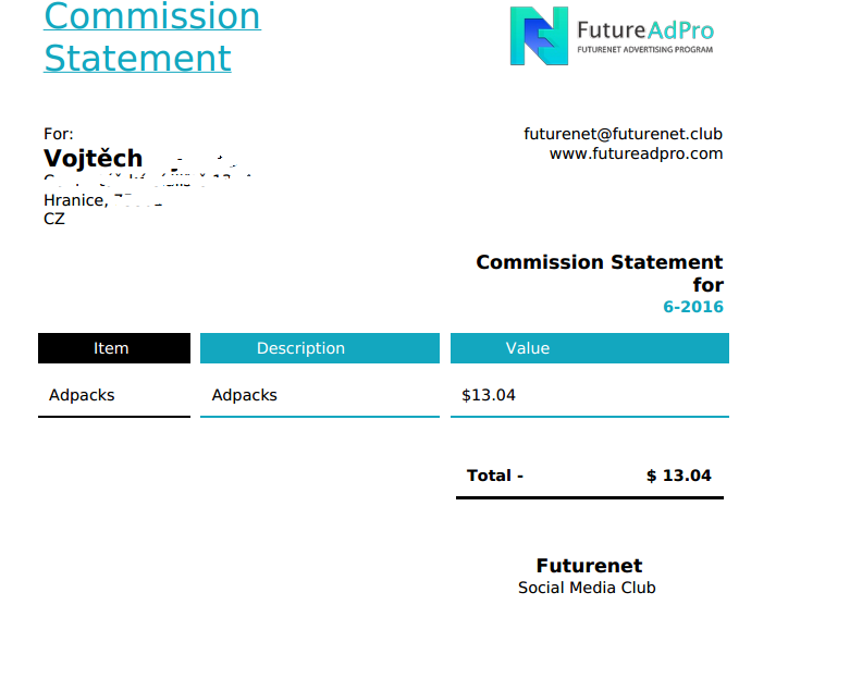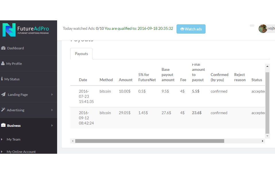 - 28. 10. 2018 testování FutureAdPro již bylo ukončeno a společnost zatím tají kdy bude spuštěna. Stará verze měla 2 dny odstávku kvůli údržbě, ale již vše běží tak jak má. Výdělky i výběry fungují.
